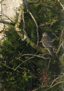 I just happened to glance out of the window. There had been a lot of noise from the resident sparrows and tits (great. blue and coal). They had been squabbling earlier about territory and I assumed that they were just doing more of the same. Then I saw the Sparrow Hawk sitting in the Chery Tree. Was he (for it is a male) guarding the nuts? I sneeked upstairs to get the camera and managed to take this shot through the kitchen window. He did not hang around long and soon flew off. But a dull day, a tedious day was suddenly special.