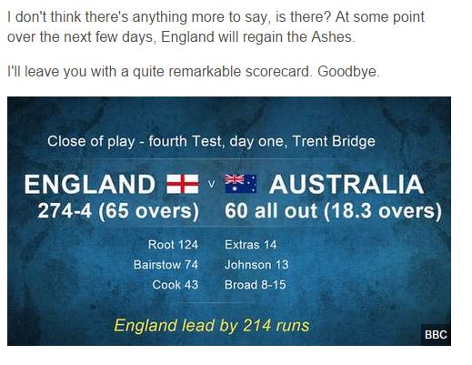 You can’t really call it a collapse. It was more a capitulation. Australia were blown away for 60. Extra’s contributed the highest to the total with 14. Of course being English, even at 15-4 there was a large part of me that expected Australia to recover and mount some sort of fight back. But the wickets kept tumbling, the superlatives were running out, and Henry who commentated on the fall of the first five wickets, was probably resting in the back of the commentary box with a cold towel over his head.